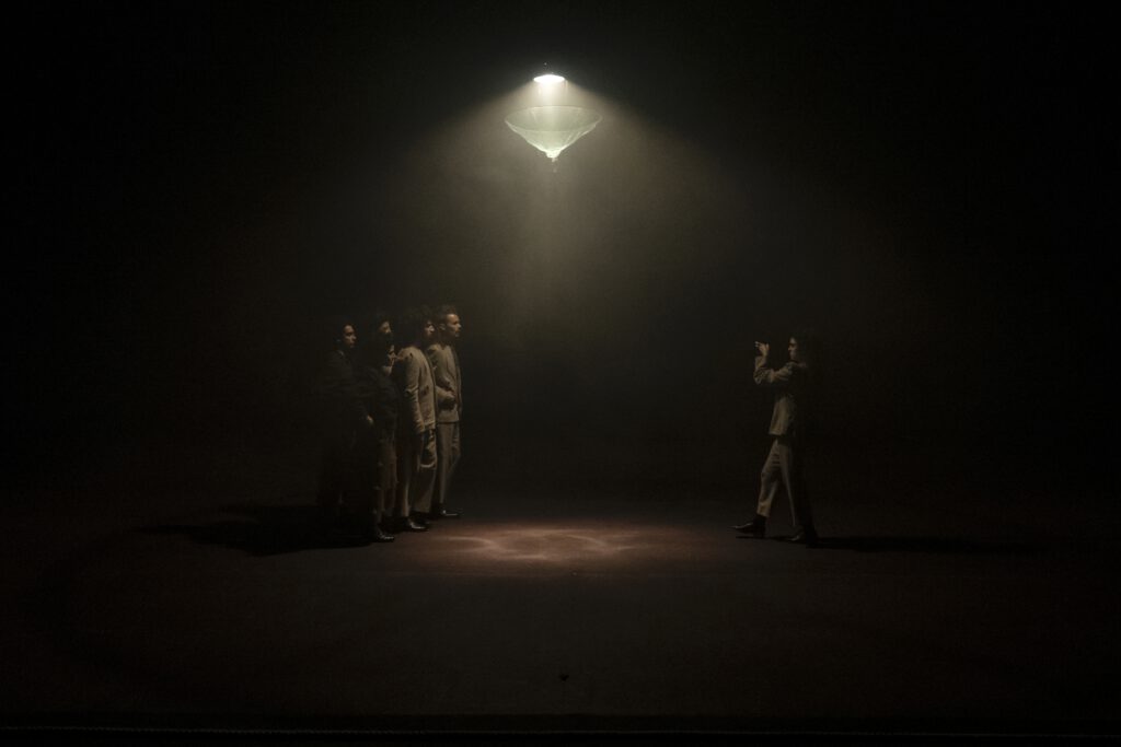 Das tun auch die wiederkehrenden Gesten und Bewegungen der Tanzenden, die oft gebückt, mit Händen auf dem Rücken oder gesenktem Kopf und ausgestreckter Hand auf der Szenerie erscheinen und dann wieder im Nichts verschwinden, aus dem sie kamen und das insgesamt surreal anmutet.